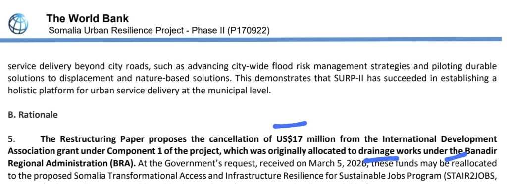 Lacag loogu talo galay drainage ka gobolka Banaadir oo aheyd $17 Million dollar waxaa lagu cancel gareeyey codsi ka yimid 5-tii March 2026 Wasaarada Maaliyadda Somalia oo ah Wasaaradda la macaamiisha World Bank, waxaana lagu dhex tuuray mashruuc kale ee Baanka aduunka oo Garoomada dalka qaar loogu talo galay STAIR2JOBS, 10 sano soconaya si halkaa looga gudbo drainage ka Magaalada Muqdisho, lacagtana wax kale ugu danbeyn loogu isticmaalo. Maadaama mashruuca Nagaad oo 2020 ilaa 2026 qaaska u ahaa drainageka iyo jidadka Magaalada dhexdooda ah ee Muqdisho wax laga qaban waayey, loo isticmaali waayey lacagta shaqada loogu talo galay!